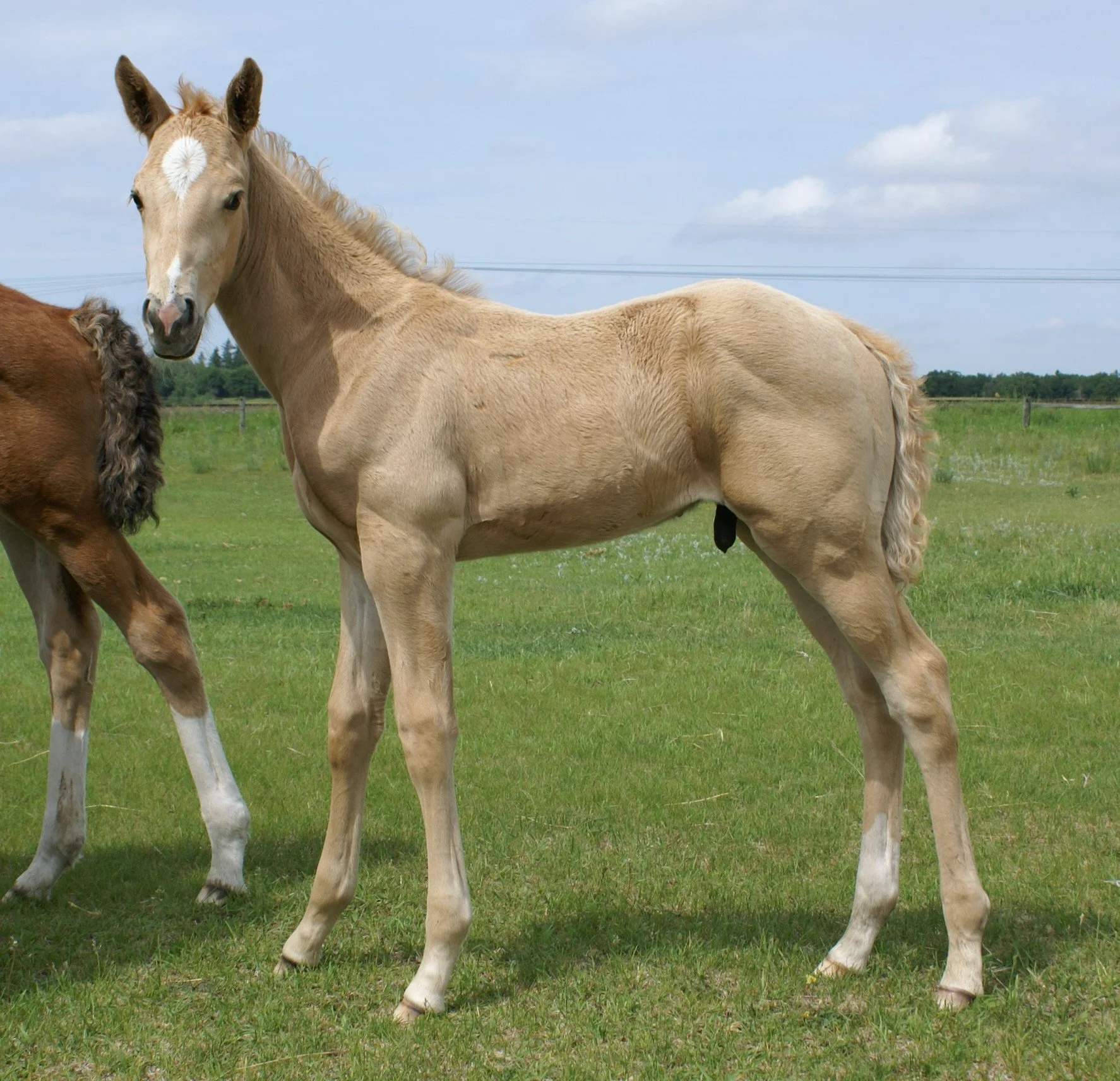 SHELLY AQHA Filly, born May 13, 2025. Palomino with a star. This girl has great legs under her and should have some size.