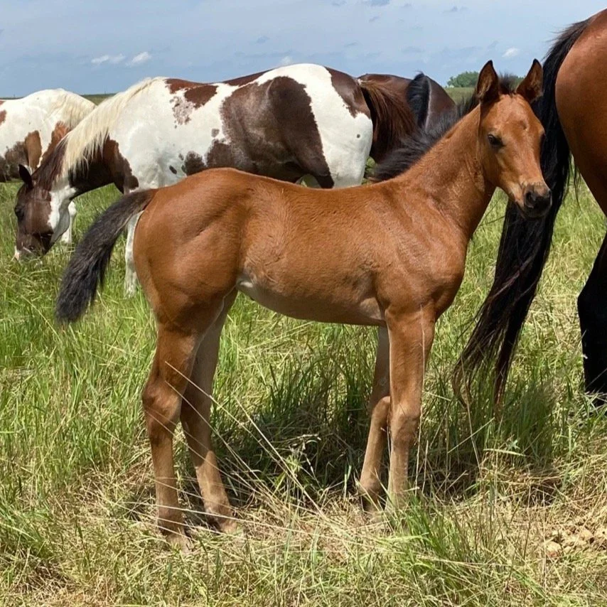 PANDORA AQHA Filly, born April 16, 2025. Bay with a star left hind sock and right hind heel bulb. This filly is well put together with just enough chrome!